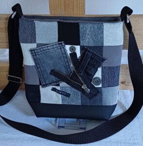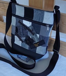 Stylische Crossbag aus verschiedenen schwarzen Jeans im modernen Karomuster. Jede Tasche ist ein Unikat und verbindet nachhaltiges Upcycling mit urbanem Design. Der robuste Denim sorgt für Langlebigkeit, während das cleane Schwarz vielseitig kombinierbar ist. Praktisch für unterwegs – mit Platz für deine wichtigsten Essentials.