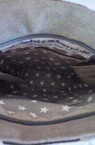 Außen: gebrauchte Jeanshosen, Kunstleder, Beschläge, Gurtband
