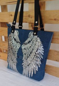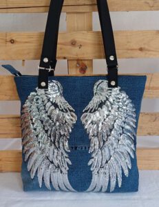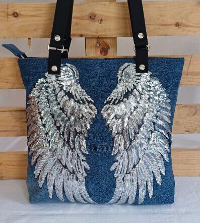 Ein schöner Shopper aus Jeans in Kombination mit silbernen Engelsflügeln.